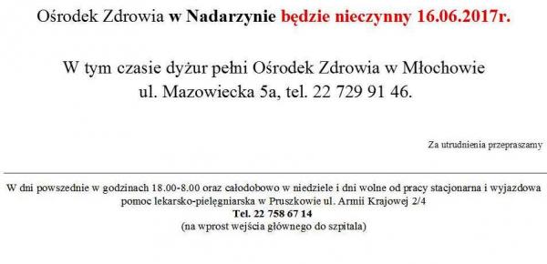 Przedsiębiorstwo Komunalne Nadarzyn Sp. z o.o. zawiadamia, że w związku z przebudową sieci wodociągowej związanej z budową drogi ekspresowej nr 8 na odcinku Paszków - Radziejowice w dniu 13 czerwca w godzinach 8:00 – 16:00 nastąpi przerwa w dostawie wody w miejscowości Stara Wieś.